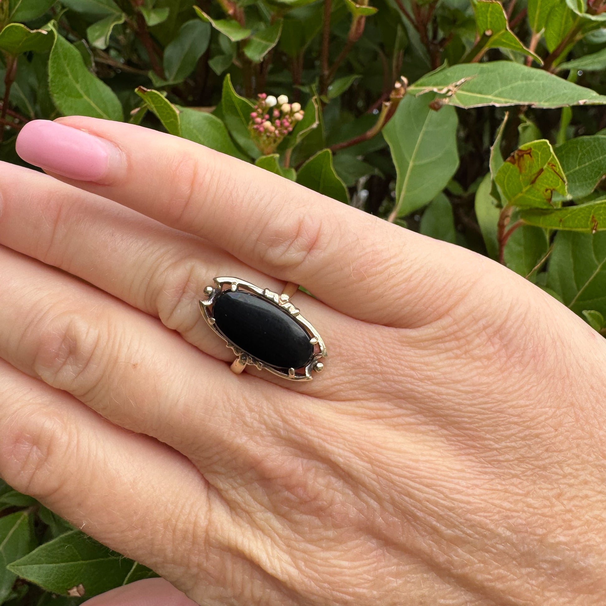 This unique vintage black onyx ring is crafted in warm solid 9ct yellow gold.