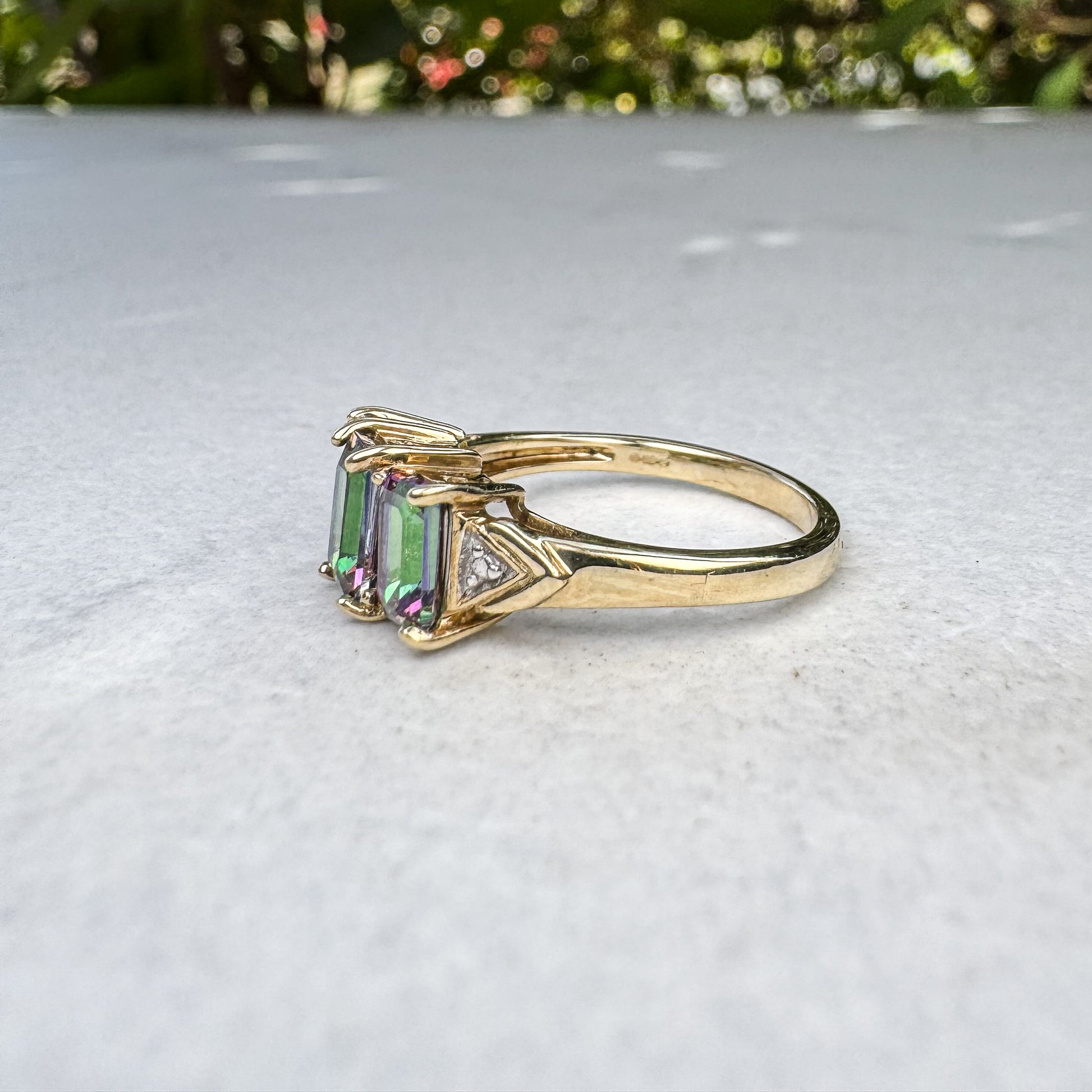This ring showcases three emerald-cut Mystic Topaz gemstones set in 9ct yellow gold. Each stone shimmers with rich green and purple iridescent colours, with the central gemstone measuring 6 x 4mm and balanced by two matching stones either side.