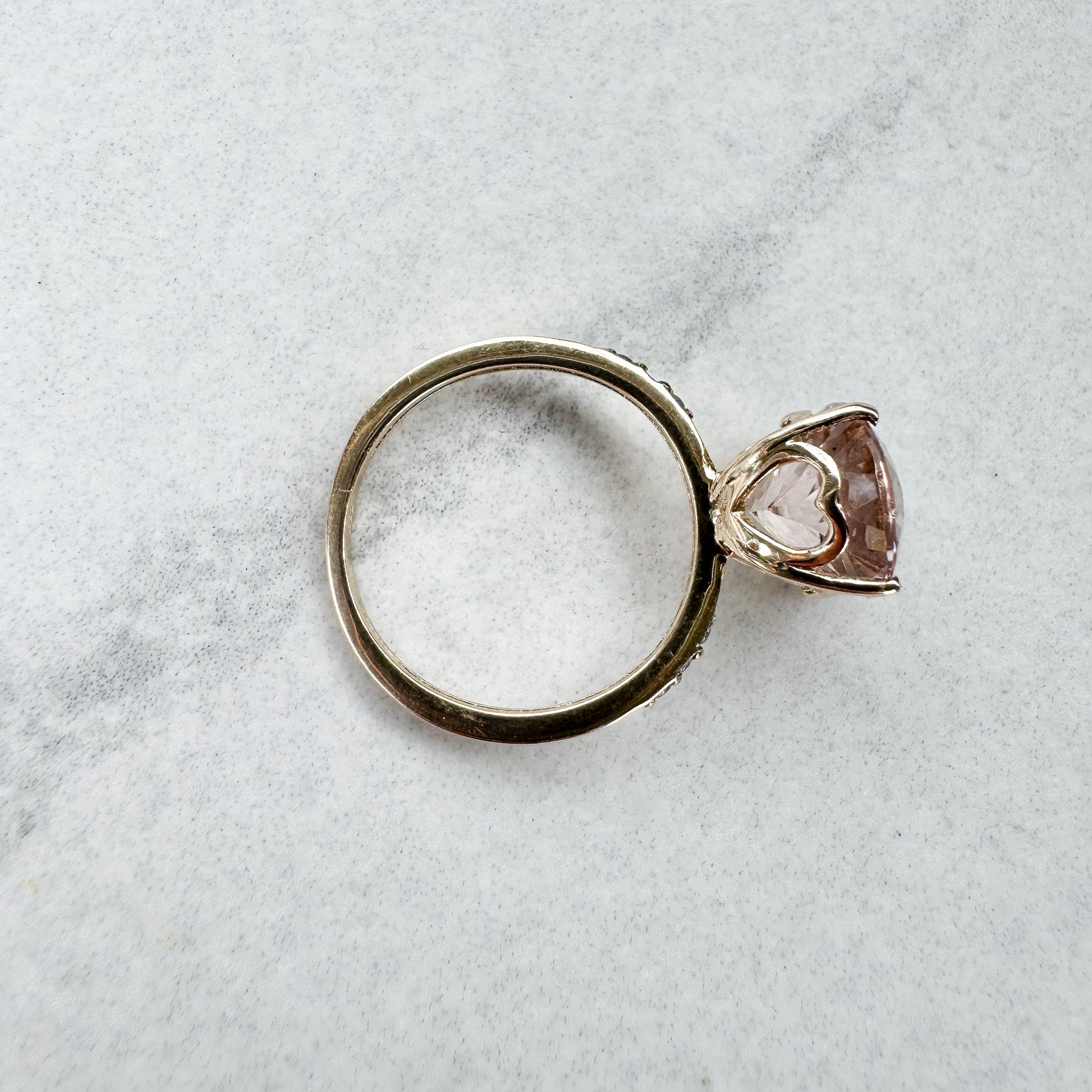 This dreamy 9ct gold cocktail ring features a blushing 4ct morganite (measuring approx. 11mm x 9mm) in a raised heart-shaped basket mount, with shimmering diamond accents along the shoulders for that added sparkle.