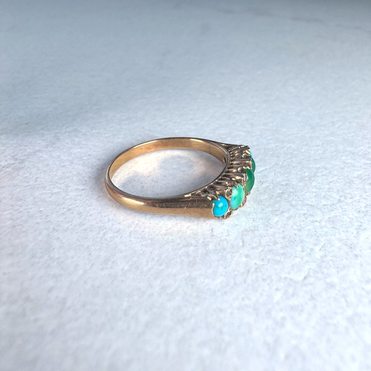 This is an exceptional Victorian-era ring, she’s crafted in 18ct gold and set with five stunning natural turquoise cabochons, elegantly accented by delicate rose-cut diamonds.